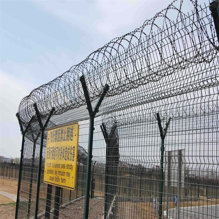 機場隔離柵高度240(cm)類型防護網;材質低碳鋼絲材質:低碳鋼絲、鋁鎂合金絲;編織:編織焊接構造:低碳鋼絲焊接而成的網片+立柱+刺鐵絲(可選)+斜撐(可選)銜接而成;網片:采用優質盤條作為原料。