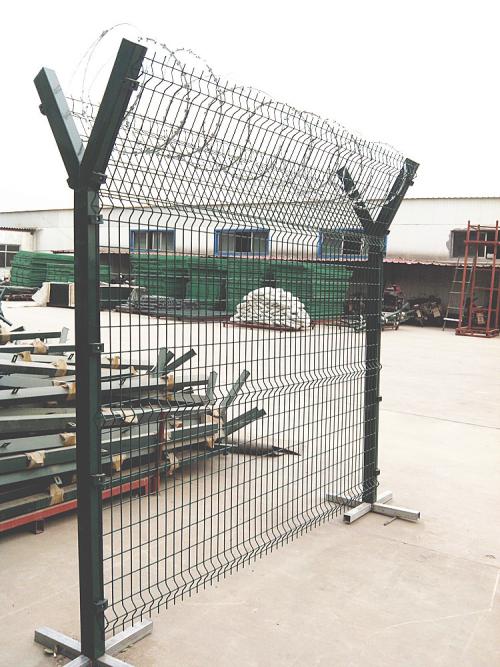 Y型安全防御護網也叫監獄鋼網墻該產品主要采用高強度鋼絲網片與蛇覆式刀片刺網和防盜連接件組合而成,防腐形式有電鍍、熱鍍、噴塑、浸塑。產品特點:立柱采用60*60方管,壁厚2.0mm,焊接成Y型,表面浸塑處理,網片高度2000mm-3000mm,長度2500mm-3000mm,,V型頂端安裝刀片刺網,直徑采用50cm-60cm,刀片刺網主要是由熱鍍鋅鋼板或不銹鋼薄板沖壓而成的。