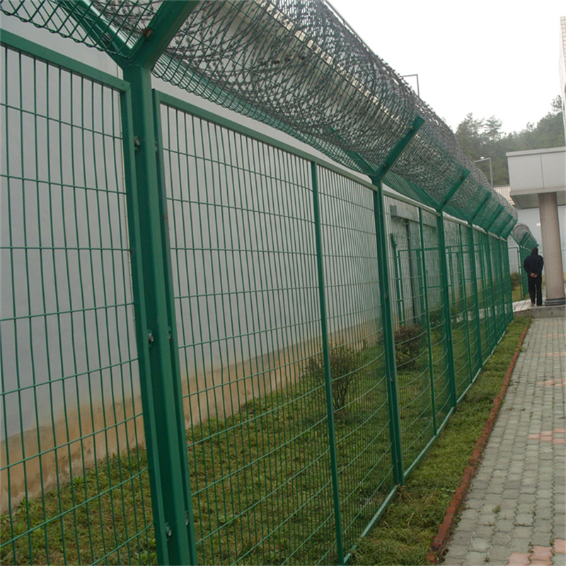 2、監獄鋼網隔離網、刀刺網設計要求整體連貫一致,框網方正,對角線誤差不大于2cm。監獄鋼網隔離網安裝離地距離5-8cm,框網與立柱一般采用螺栓固定邊耳式連接,網片每邊與立柱連接點不少于六處。