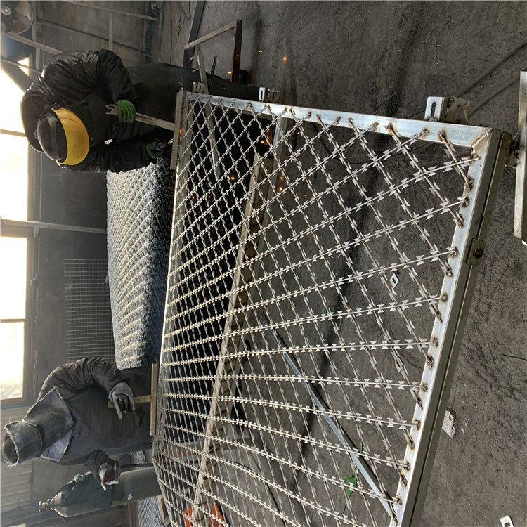 4.接下來就要焊接隔離網了。將焊接好的刀刺網按照施工圖紙對網面進行進一步處理,焊接好邊框和立柱后就可以進行表面處理了。