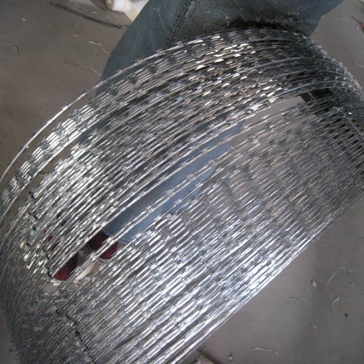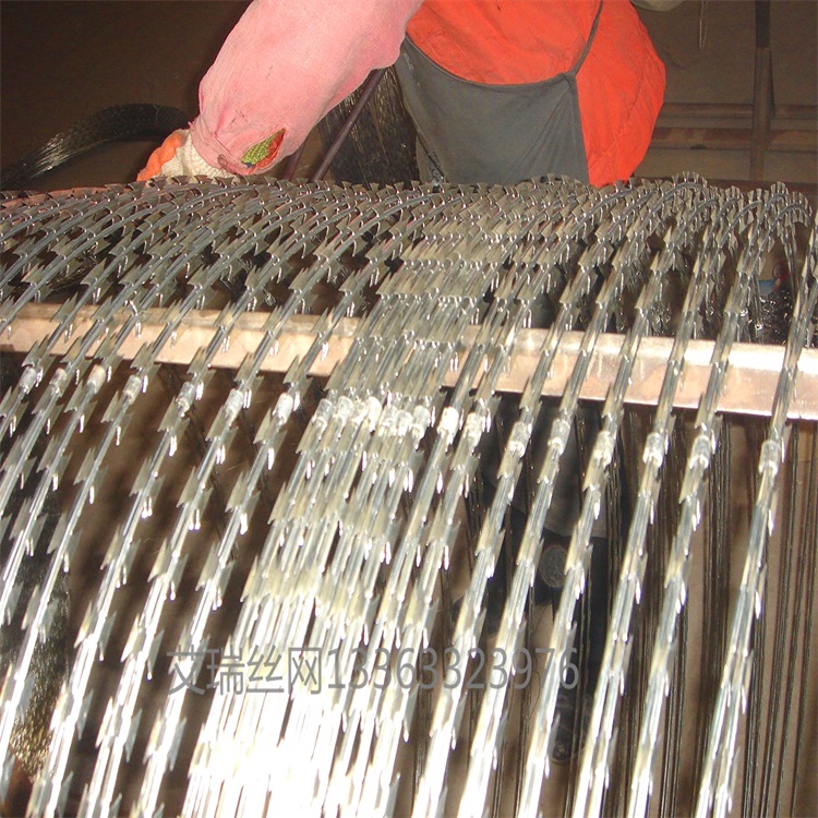 1,刺絲滾籠采用的刀片刺繩繞圈后相鄰的兩圈每隔120度便應用刺絲連接卡進行固定,并且使其張開后形成蛇腹網狀。不僅如此,刺絲滾籠在閉合之后的刀片刺繩卷經應為50厘米,張開后每交叉圈的安裝間距應為20厘米,直徑不得小于45厘米。