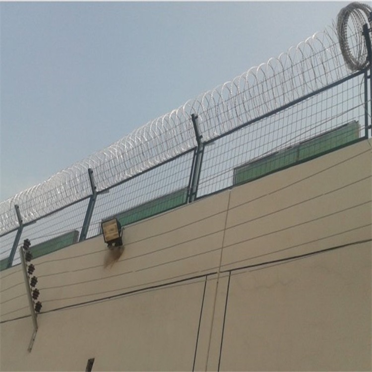 監獄防攀爬圍欄網具有結構新穎、鞏固緊密、網面平坦、網孔均勻、刀鋒銳利、防攀爬、抗腐蝕性強等特點。建設于監獄的內外墻地面及高墻之上,網墻內側或頂部加裝蛇腹形刀刺網,構成一道高不可攀、難以逾越的阻隔障礙。合作高壓打擊電網、各種監控報警設備確保監獄安全滿有把握。