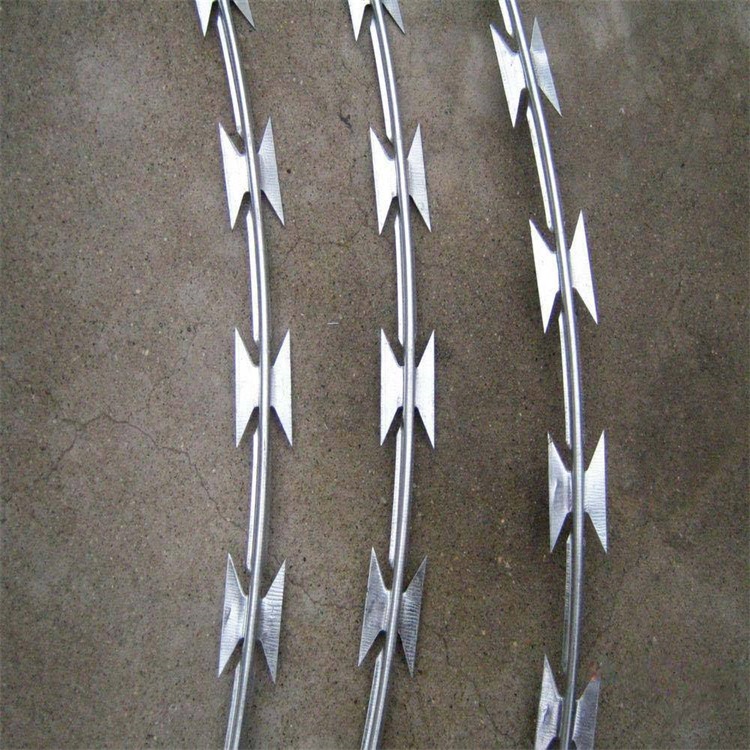 制造及特點:鋼絲為芯絲,將沖壓好的刀片包裹在芯絲上,一次制成。具有極強的防護能力和優秀的恐嚇能力,安裝方便,壽命長。它分為直線型、交叉型、直線盤繞型、交叉盤繞型和十字交叉型。