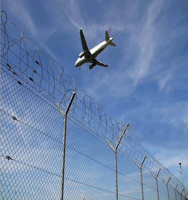 機場護欄網又稱作“Y型安全防御護網”,是由V型支架立柱,加強型焊接片網,安全防盜連接件和熱鍍鋅刀片刺籠組成強度和安全防御性級別很高。近年來,被廣泛應用在機場,軍事基地等高安全場所。注:如果在機場護欄網頂部加裝刀片刺絲、刀片刺繩后又很好的增強了安全防護性能。采用電鍍、熱鍍、噴塑、浸塑等防腐形式,具有很好的抗老化、抗曬、耐候等特點。其產品造型美觀、花色多樣,既起到圍欄作用,又起到美化作用。由于具有安全性高、防攀爬能力好,網片連接方式采用特制SBS緊扣件,有效防止人為的破壞性拆卸,橫向四道折彎加強筋,使網面強度顯著增加。