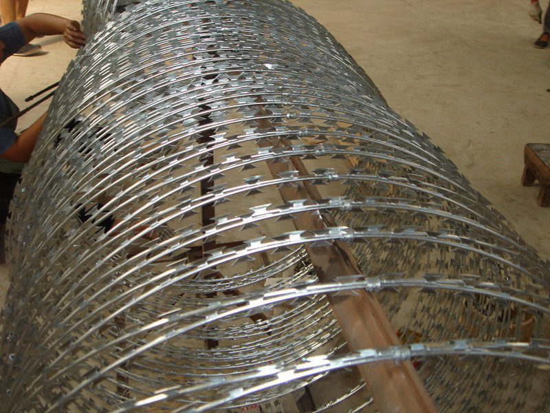 不銹鋼刀片刺網(wǎng)也稱為不銹鋼刀片刺絲、不銹鋼刀片刺繩,是一種新型防護(hù)網(wǎng)。不銹鋼刀片刺網(wǎng)具有美觀、經(jīng)濟(jì)實(shí)用、防阻效果好、施工便利等優(yōu)異特點(diǎn),不銹鋼刀片刺網(wǎng)已被廣泛應(yīng)用于許多國家的工礦企業(yè),園林公寓,邊防哨所,軍事領(lǐng)域,監(jiān)獄,看守所,政府建筑物和其他國家的安全設(shè)施。