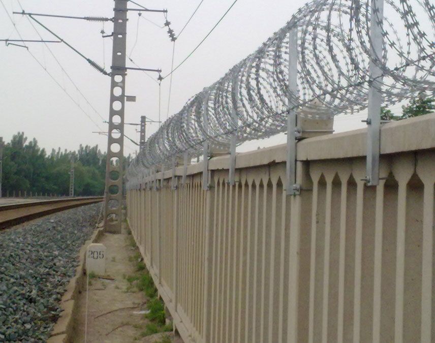 鐵路刀刺滾籠是鐵路護(hù)欄線(2012)8001中鐵路路基護(hù)欄的防護(hù)材料。刀片穿孔網(wǎng)采用熱鍍鋅鋼板或不銹鋼板沖壓出鋒利刀片、高壓鍍鋅鋼絲或不銹鋼絲作芯線。由于刺網(wǎng)形狀獨(dú)特,觸碰困難,可達(dá)到優(yōu)良的保護(hù)和隔離效果。 0.5米高的鋼絲籠:刺絲刺繩+刀刺滾籠+鋼絲+立柱支架;