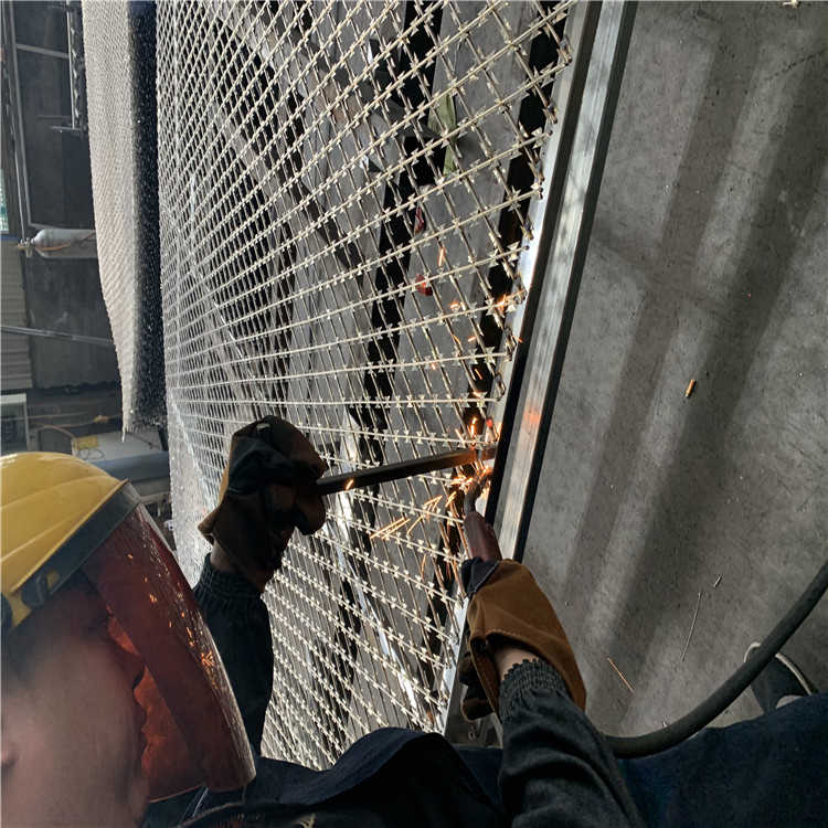 第四步,接下來就要焊接隔離網了。將焊接好的刀刺網按照施工圖紙對網面進行進一步處理,焊接好邊框和立柱后就可以進行表面處理了。