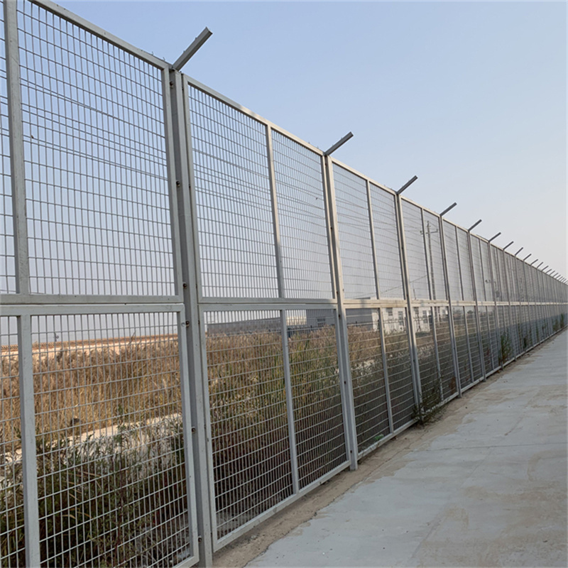 監獄警戒區隔離網立柱間距3m(也可根據實際情況調整)邊框與立柱采用螺栓固定邊耳式連接,邊耳均為  40mm*40mm*6mm扁鐵,邊耳螺孔可調,調節距離不小于15mm;邊耳固定螺栓為直徑14mm*50mm全絲熱鍍鋅安全螺栓、螺母,每片網單邊連接點為6個以上。隔離網設計要求整體連貫一致,框網方正,對角線誤差不大于2cm。