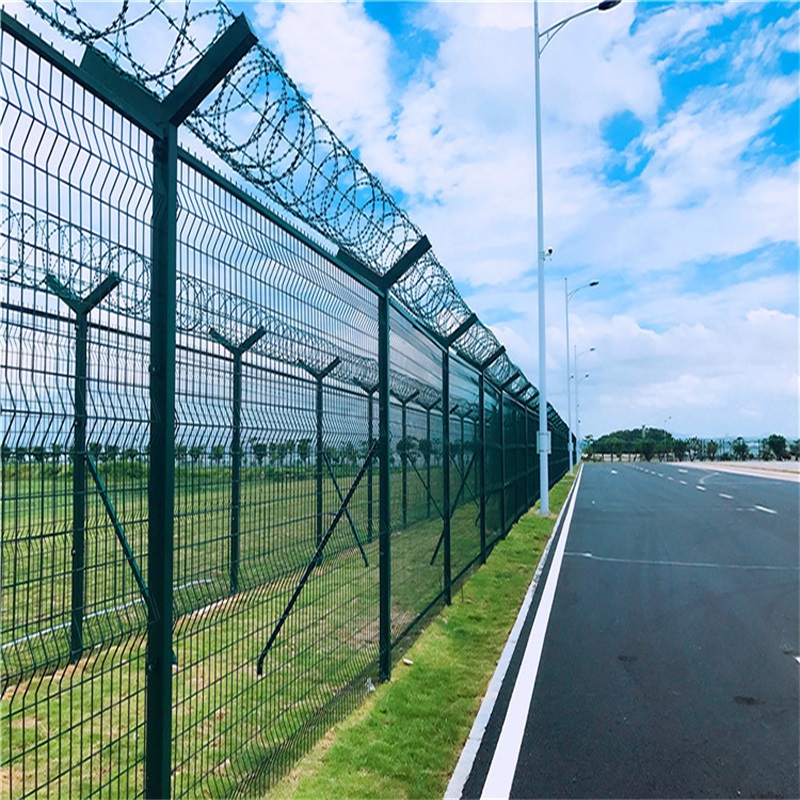 1、機場圍界護欄也被稱為機場護欄或Y型安全保護網,由V形支架立柱,加強焊接網片,安全防盜聯接件和熱浸鍍鋅刀片組成。