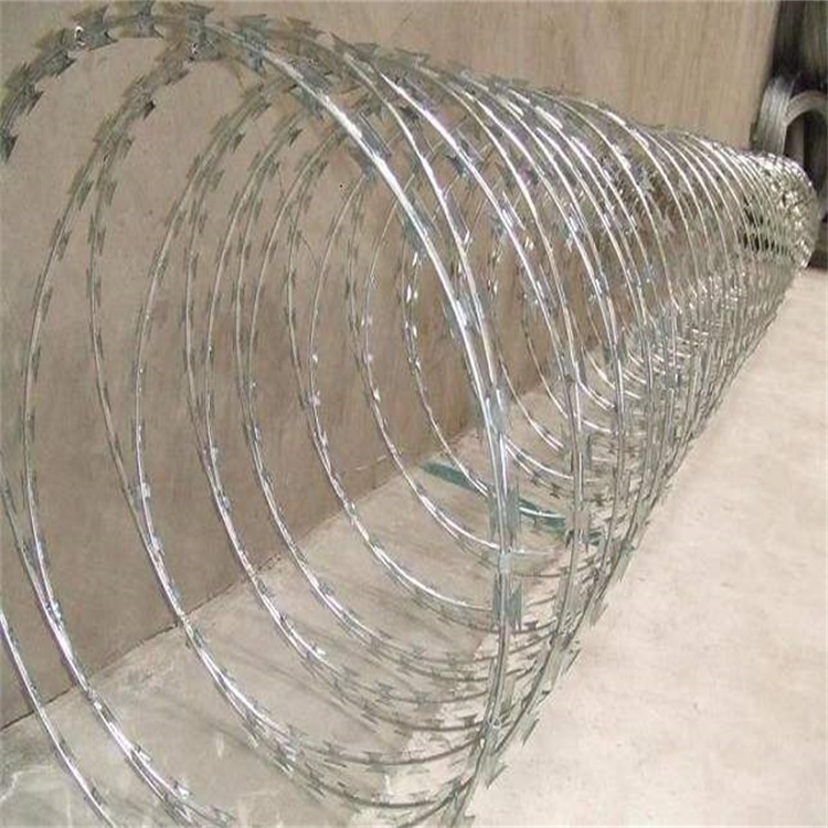 蛇腹形刺絲滾籠采用刀片刺繩繞圈后相臨兩圈每隔120°用刺絲連接卡固定,張開(kāi)后形成蛇腹網(wǎng)狀,閉合后刀片刺繩圈徑為50cm,張開(kāi)后每交叉圈安裝間距20cm,直徑不小于45cm。