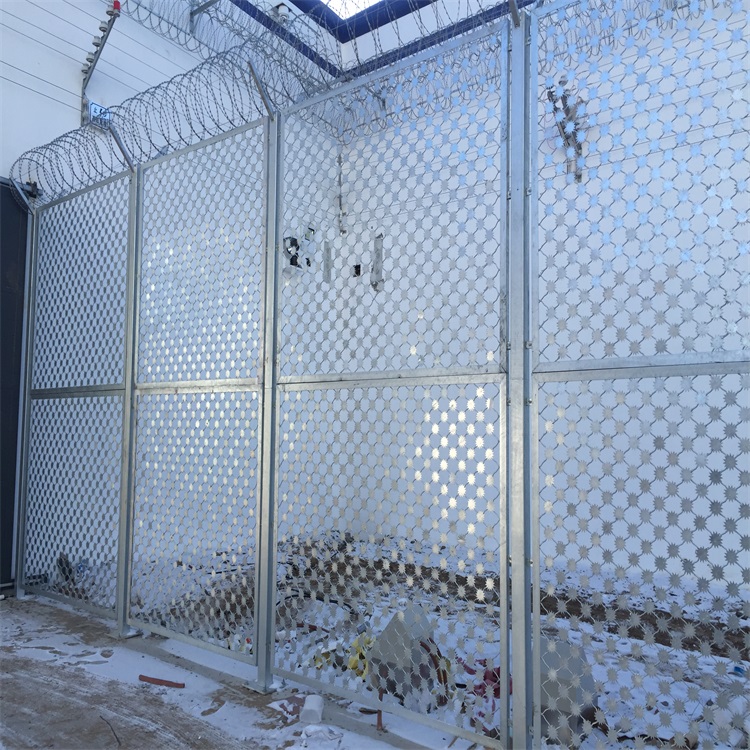 將不銹鋼拉絲固定在隔離網(wǎng)的頂部,形成一個v型托網(wǎng)用于架設蛇腹形刀刺網(wǎng),將刀刺網(wǎng)按照12cm的間距均勻鋪設在v型支架上,用不銹鋼防拆卸卡扣與v型托網(wǎng)上的不銹鋼拉絲固定。在安裝完成后,對梅花刺片隔離網(wǎng)的防攀爬性能,進行跨越、防破壞測試。