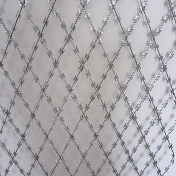焊接刀刺圍欄網選用Q195L熱鍍鋅帶鋼(或者不銹鋼帶鋼),根據客戶選定的刀型,經高速沖床,沖軋成鋒利的刀片刺條, 把沖好的刀片裹在熱鍍鋅絲上面,經調直達到預定的長度自動切斷,送入到模具內,排焊機把經和緯相交叉的部分,沖過電流焊接到一起,數控電機拉動網片前進一格,達到網片的長度后,排焊機自動停止, 焊接刀片刺繩網制作完成。該生產工藝是根據電焊網片改進而成。