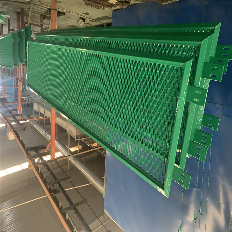 用于高速公路的防眩目網(wǎng),擴(kuò)展網(wǎng)隆起的梗部,可有效減輕夜間行車時(shí)對(duì)方來車的強(qiáng)烈燈光造成的炫目感,使高速公路行車更加舒適安全。鋼板護(hù)欄網(wǎng)表面處理多采用熱鍍鋅和噴塑,以增強(qiáng)其表面的抗腐蝕性和美觀性。材料:用鋼板網(wǎng)、異型管、邊耳、圓管焊接成的防眩網(wǎng)。用連接附件與熱鍍管支柱固定。