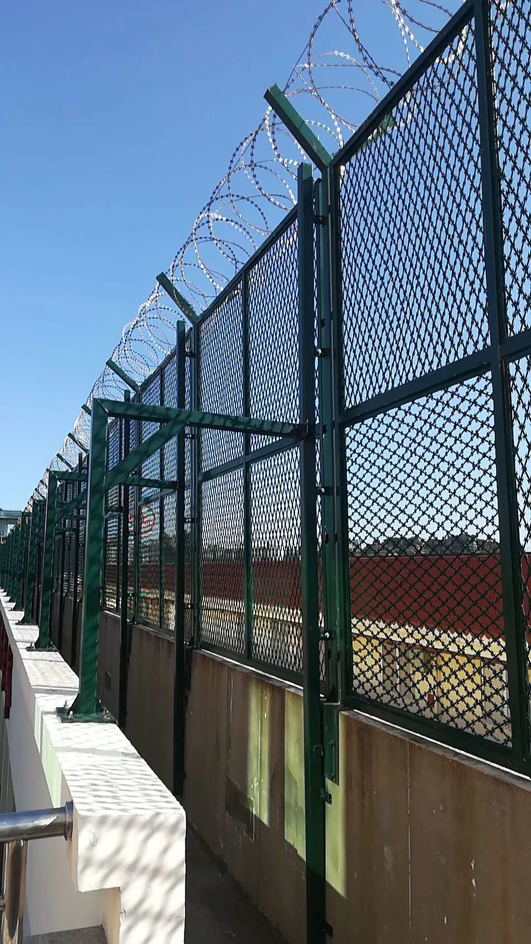 熱鍍鋅金屬監獄鋼網墻主要是選用高強度的刀片刺網與普通防護網的結合,由V型支架立拄,加強型焊接片網,安全防盜銜接件和刀片刺網組成.一種新型防護網,由銳利尖角鍍鋅鋼板或不銹鋼薄板做刀片,鋼絲做芯線組合而成的防護器件. 監獄鋼網墻刀片刺網具有嚇阻、防翻越等作用,原料堅固,高強度,高張力,造型設計共同,不宜觸摸,因而能到達極好的防護阻隔作用。