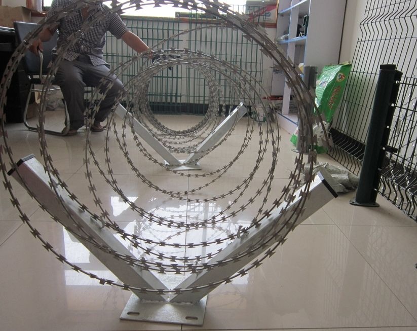 邊選中支架固定。刺絲滾籠用在鐵路上一般用立柱支架和加密支架固定刀刺網。用在其他場所多用V型支