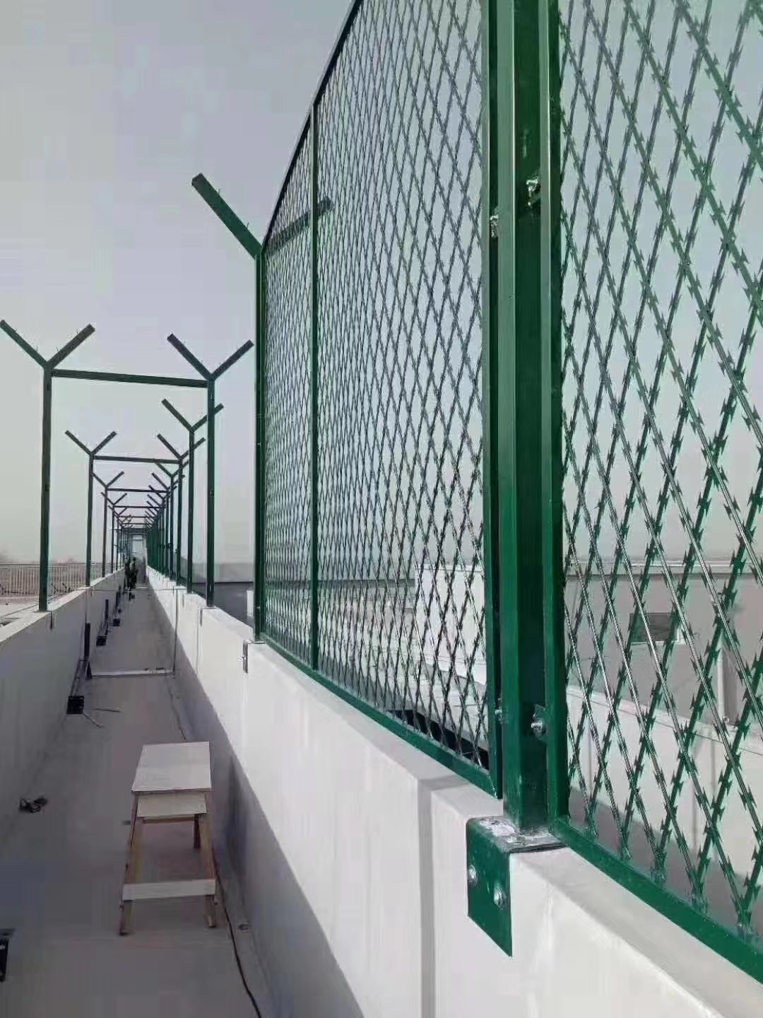 上面裝有刀片刺網(刺絲滾籠),蛇腹型刀片刺繩具有阻嚇防觸碰的效果,材質堅硬、高張力、高強度.不易觸摸等能達到***好的隔離效果。
