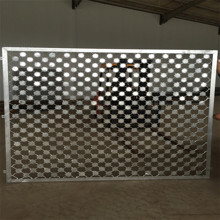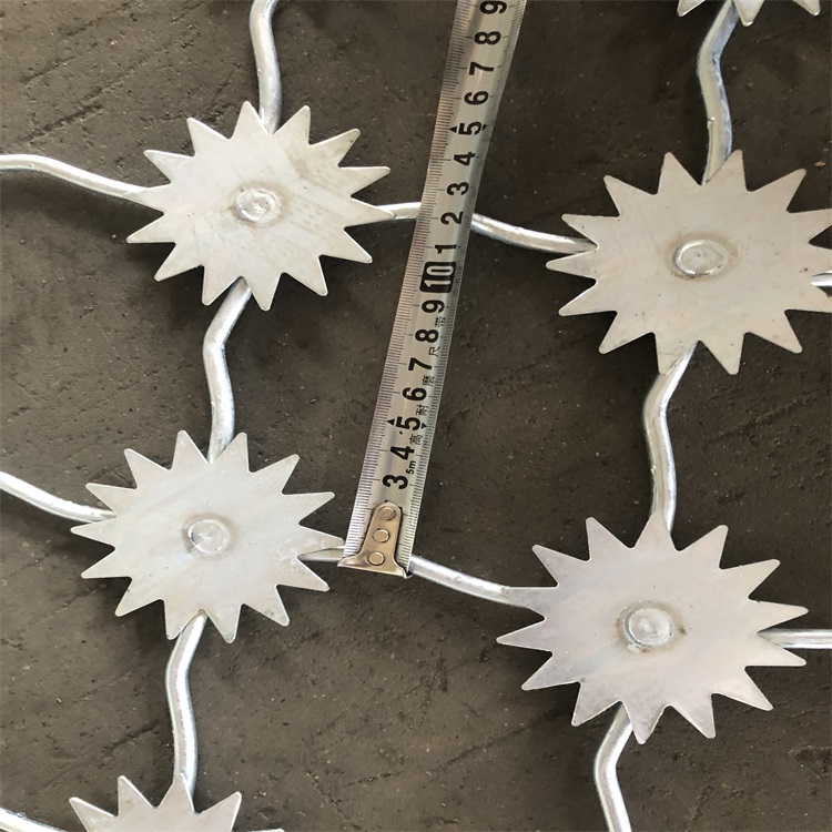 1、梅花刺片防護(hù)網(wǎng):梅花刺片片直徑不小于7.5cm(直徑6cm、7cm、8cm),刺片厚1.5mm,采用Q235低碳鋼板沖壓成型。梅花刺片片用氬弧焊將梅花形刺片焊接在美格網(wǎng)的節(jié)點(diǎn)上,形成刺形保護(hù),有效的防止了手握腳攀。