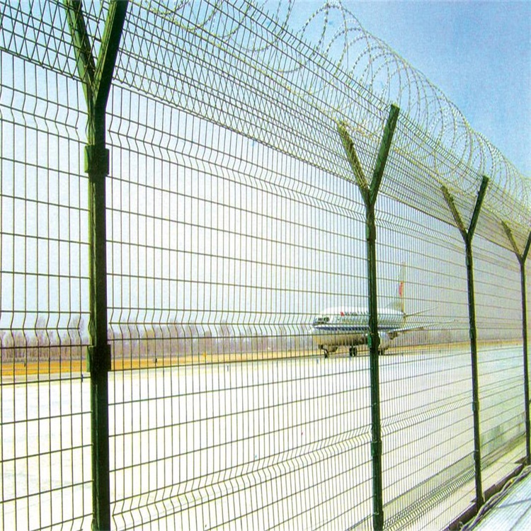 機場隔離網又稱作“Y型安全防御護網”,是由V型支架立柱,加強型焊接片網,安全防盜連接件和熱鍍鋅刀片刺籠組成加強度和安全防御性級別很高。近年來,被廣泛應用在機場,軍事基地等高安全場所。注:如果在機場護欄網頂部加裝刀片刺網,刀片刺繩后有很好的增強了安全防護性能。采用電鍍,熱鍍噴塑,浸塑等防銹形式,具有很好的抗老化,抗曬,耐候等特點。其產品造型美觀,花色多樣,既起到圍欄作用,又起到美化作用。由于機場隔離網具有安全性高,防攀爬能力好,網片連接方式采用特制SBS緊扣件,有效防止人為的破壞性拆除,橫向四道折彎加強筋,使網面強度明顯著增加。